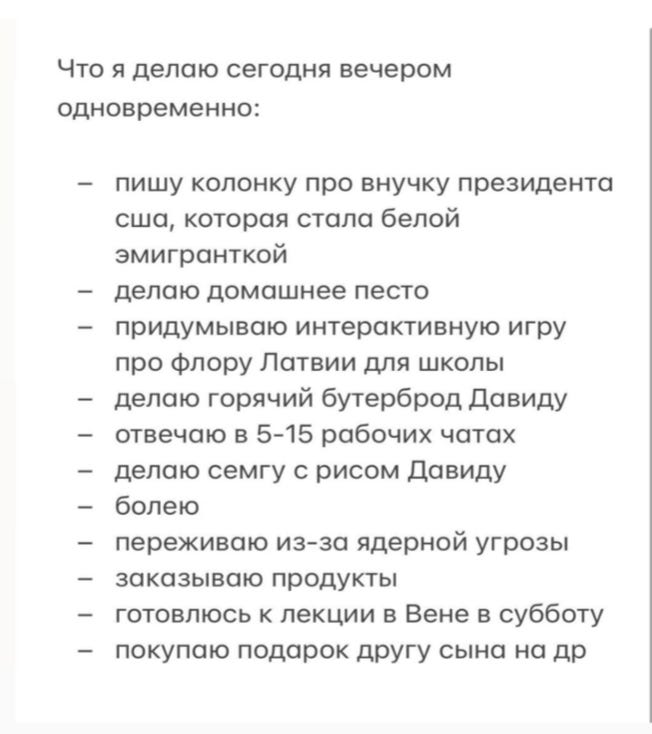 Правда в том, что времени не остается даже на жизнь. Я недавно подсчитала, что в среднем в будние дни после работы, кружков, домашки, готовки и уборки у меня остается около 15-30 личного времени до сна. В которые я могу только отупевшим взглядом уставиться в экран с новым сериалом, переживая за судьбу сестер Гарви и потягивая остывший чай с ромашкой (нервничать нельзя, это плохо сказывается на ребенке). В прошлые выходные я решила составить список вещей, которые я делала одновременно вечером воскресенья. Получилось так: